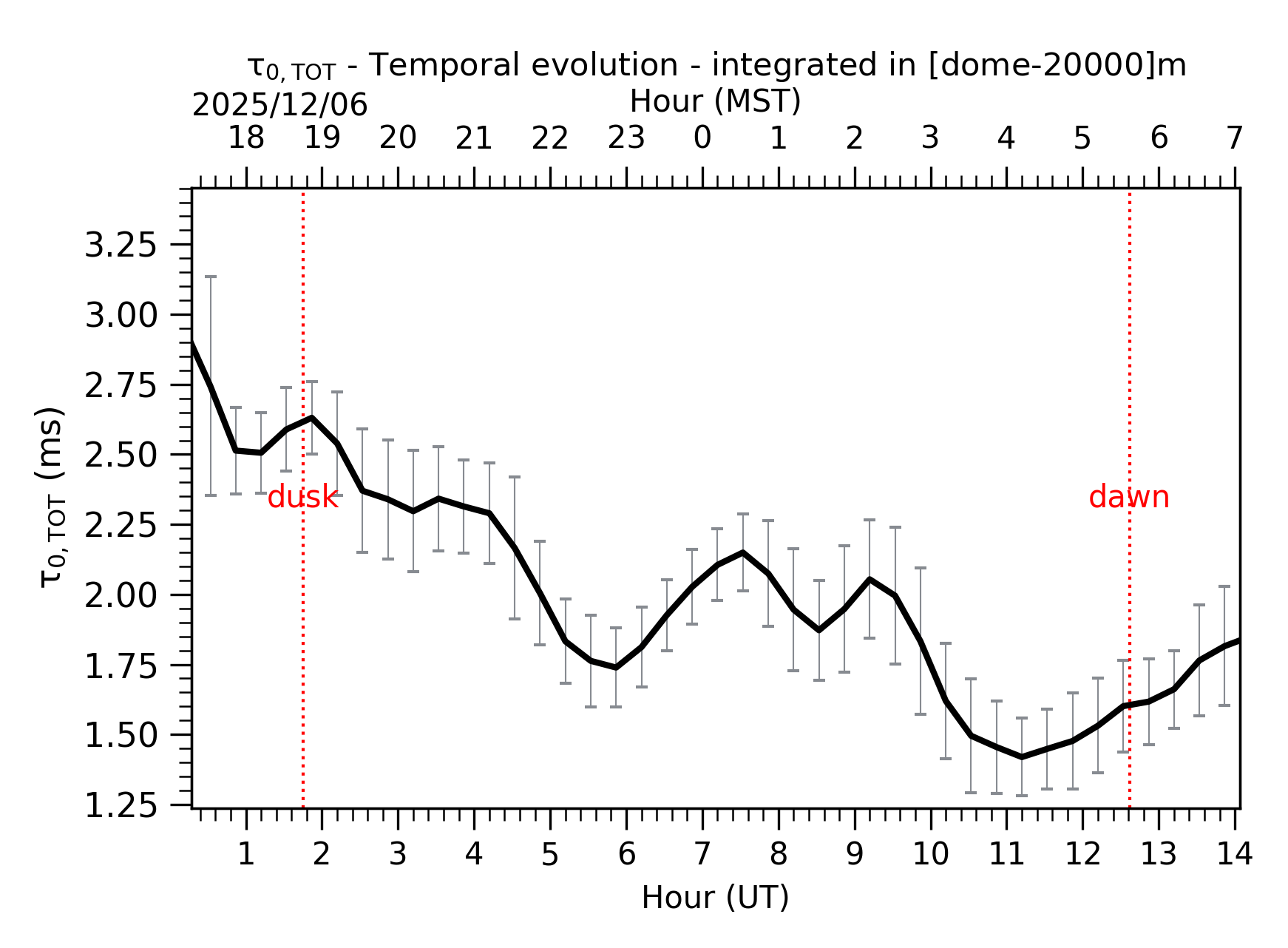 Fig. 1: Temporal evolution of τ0,TOT ([dome-20km]) between the sunset and the sunrise. |