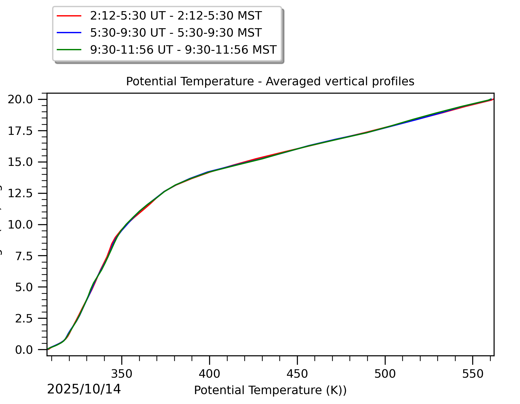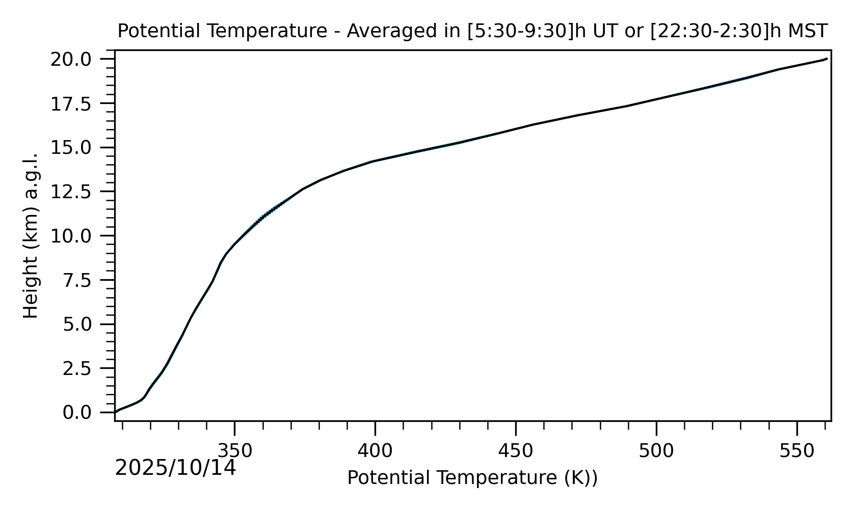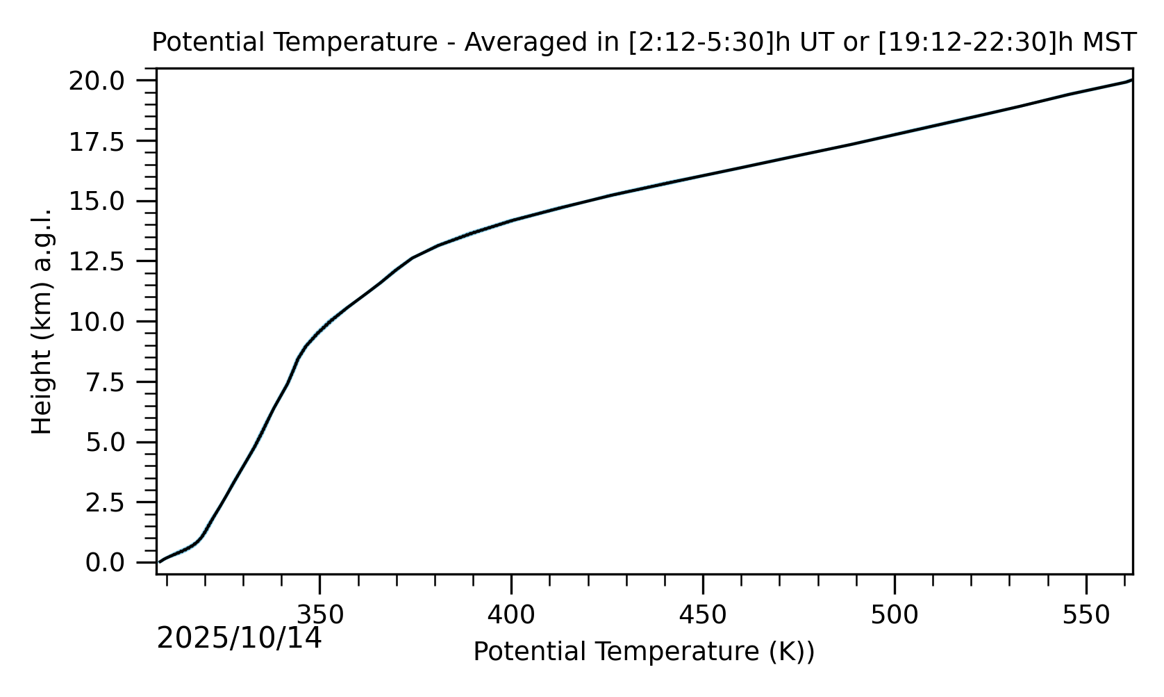 Vertical profiles of the potential temperature are computed in the [0-20km] range above ground level (a.g.l.) and centered on the LBT. Data points frequency is 2 minutes.- TIME AVERAGES: