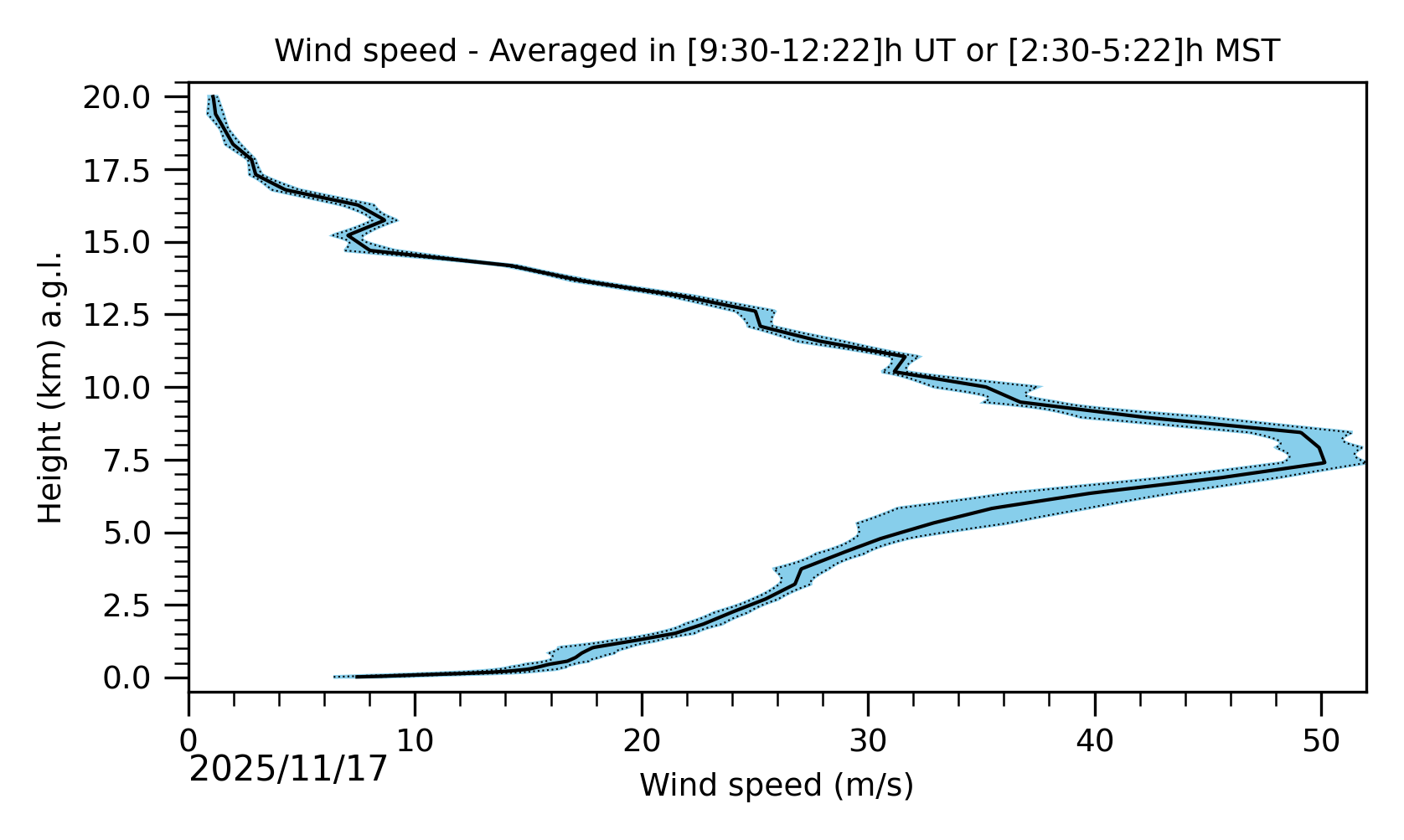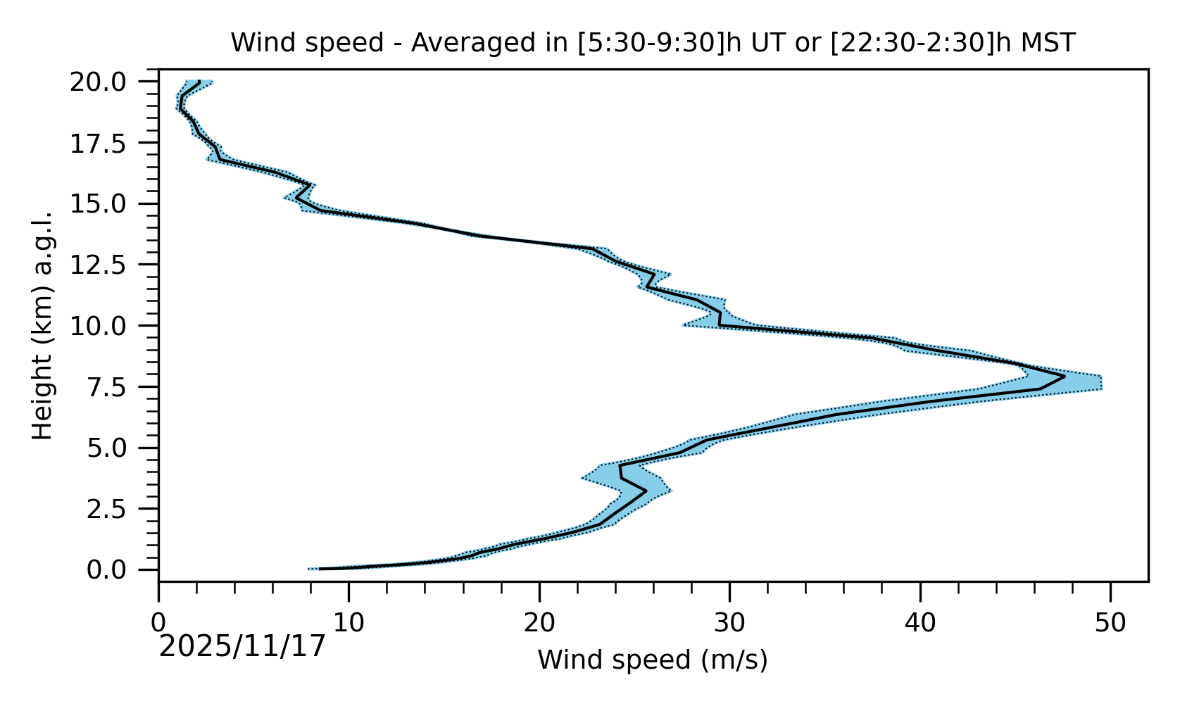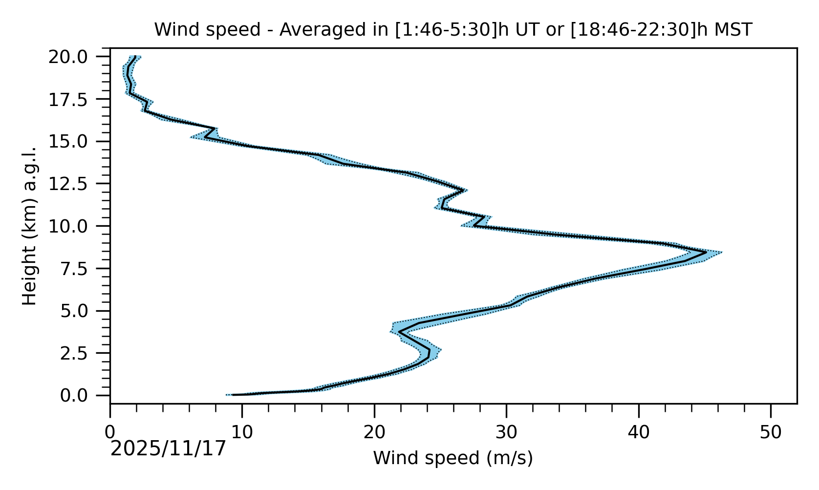 The contour plot represents the temporal evolution of wind speed vertical profiles between the sunset and the sunrise. On the x-axis is time in UT (bottom), in MST (top). Mountain Standard Time MST=UT-7. On the y-axis the height above ground level. The color scale refers to the wind intensity.