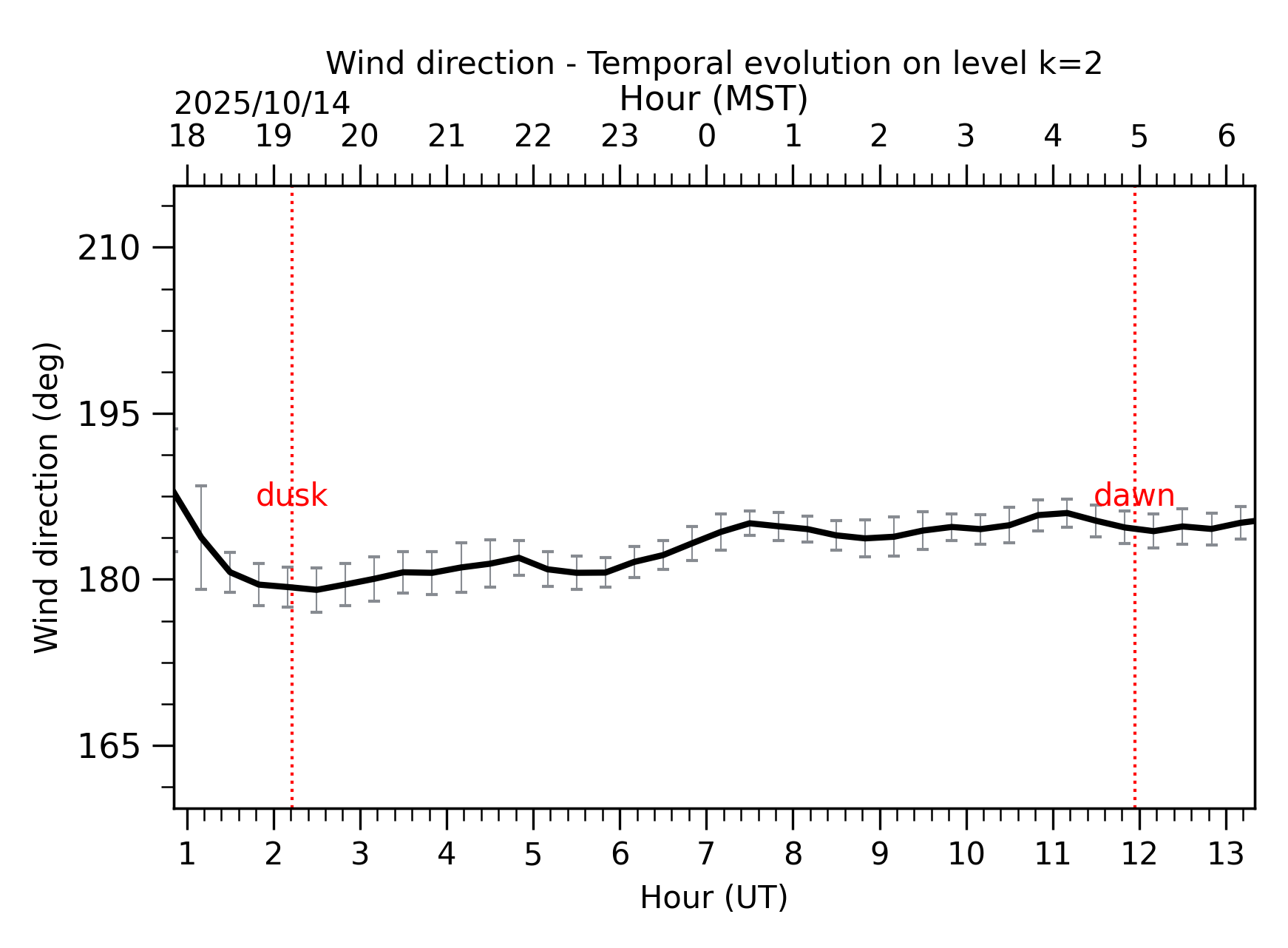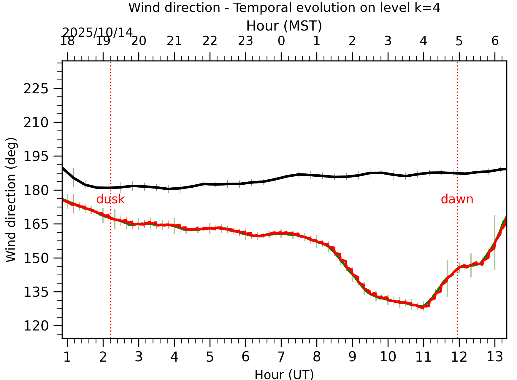 Fig. 2: Wind direction temporal evolution between the sunset and the sunrise at [0-17]m. |