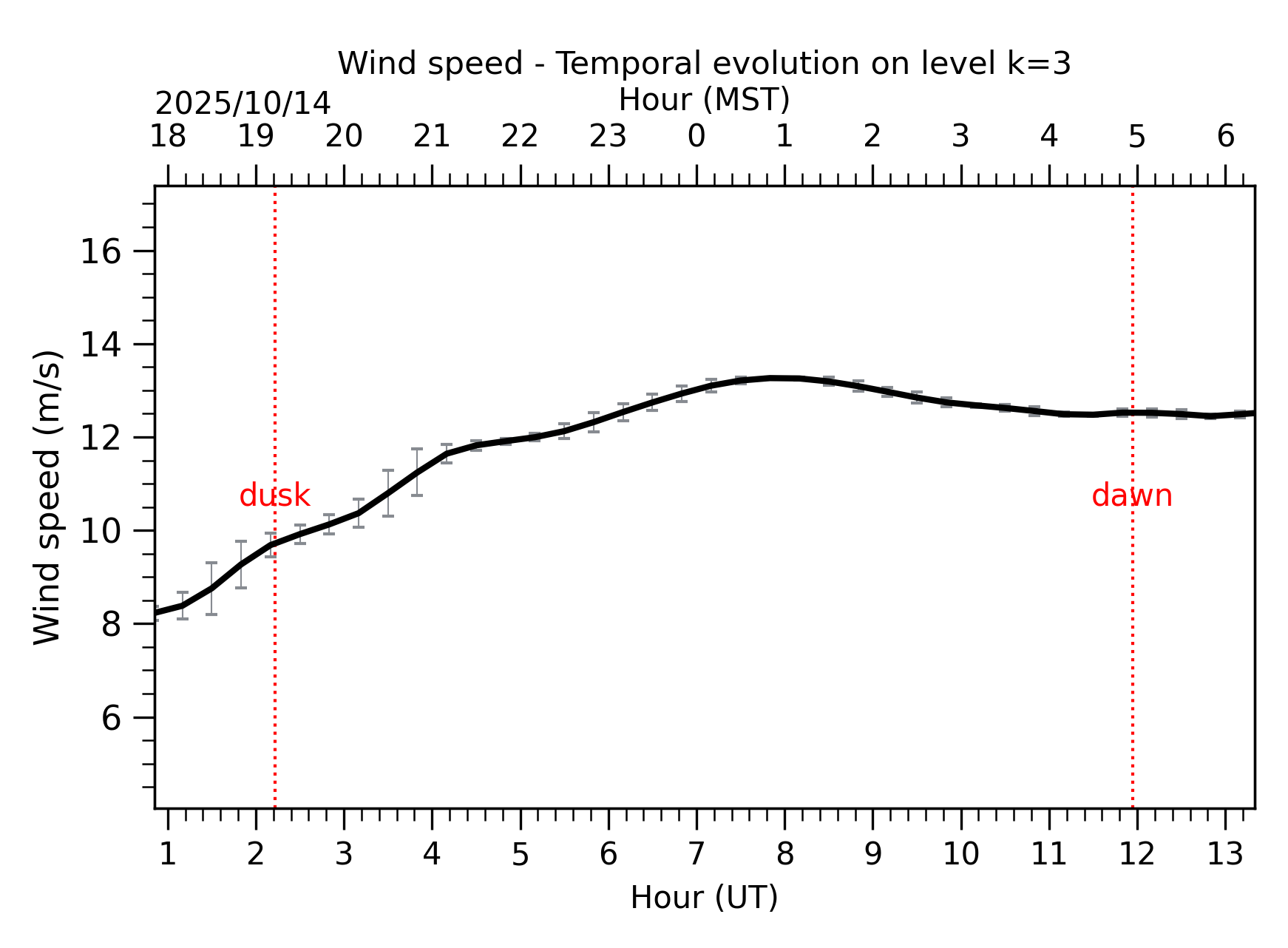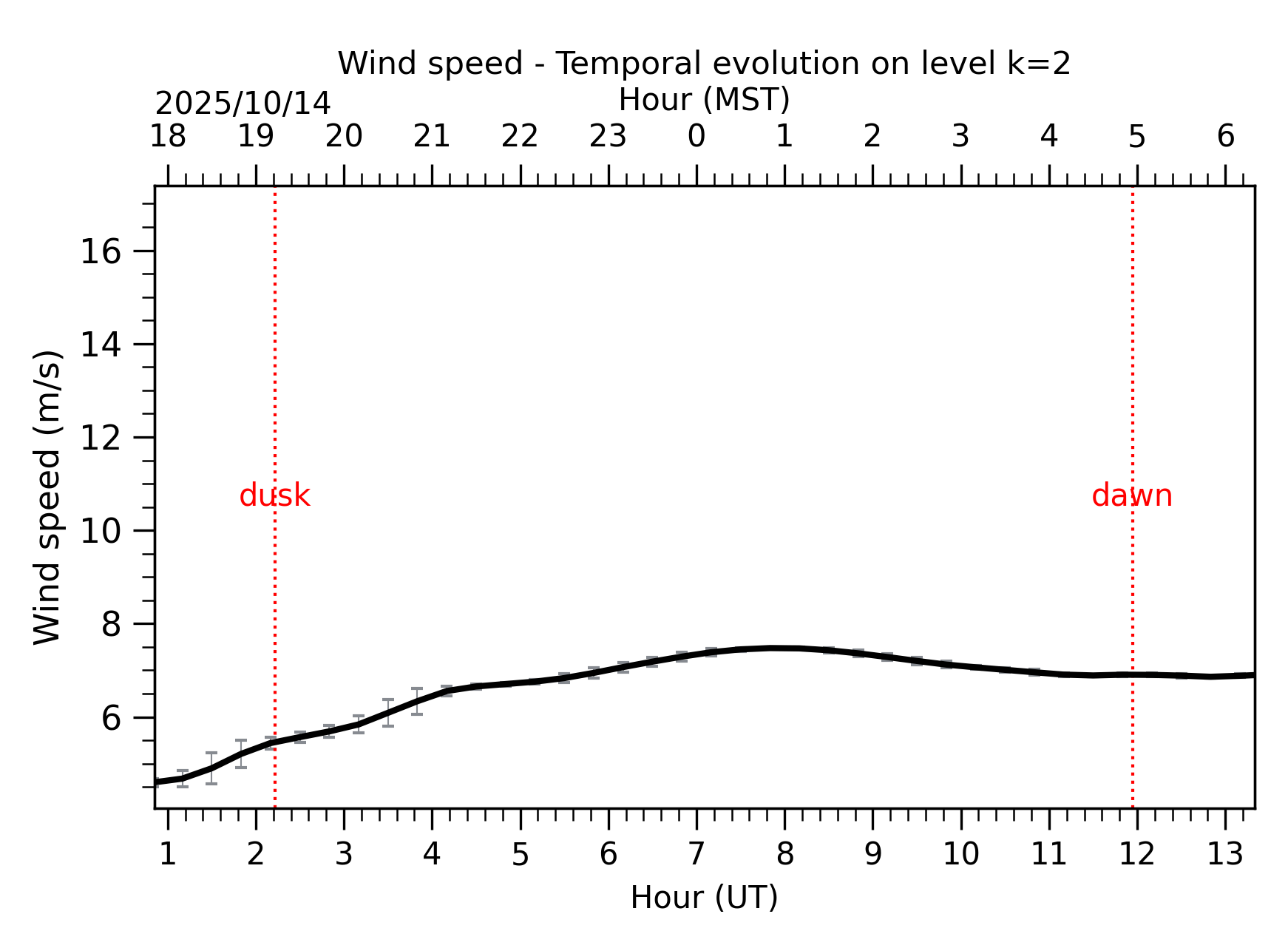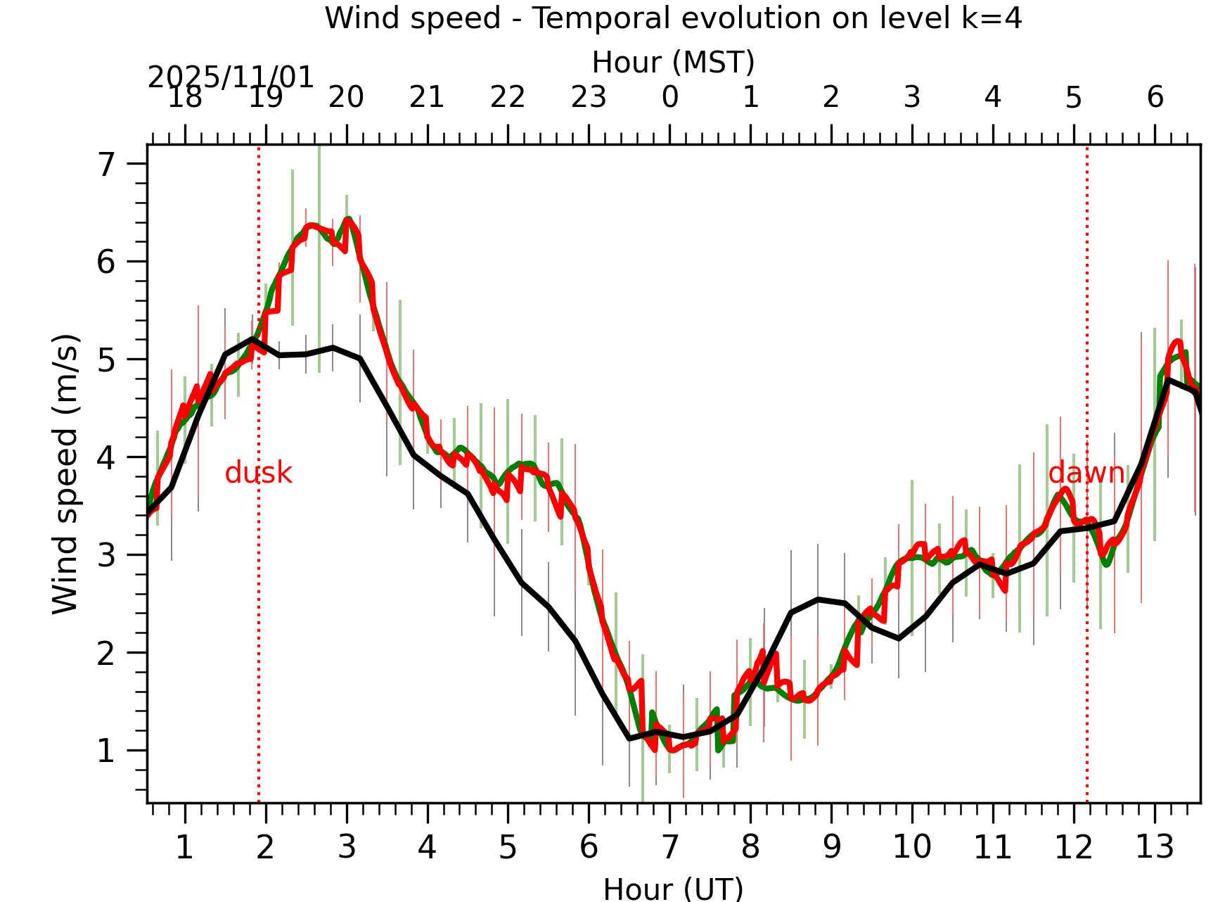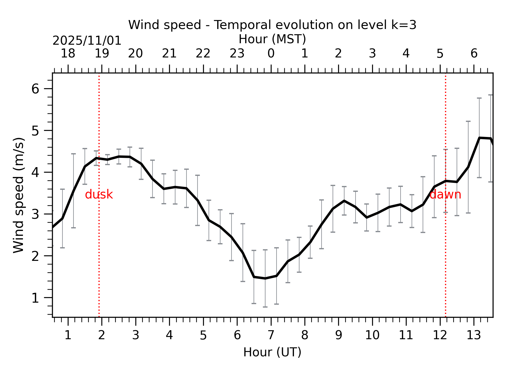 Fig. 1: Wind speed temporal evolution between the sunset and the sunrise at [0-17]m. |