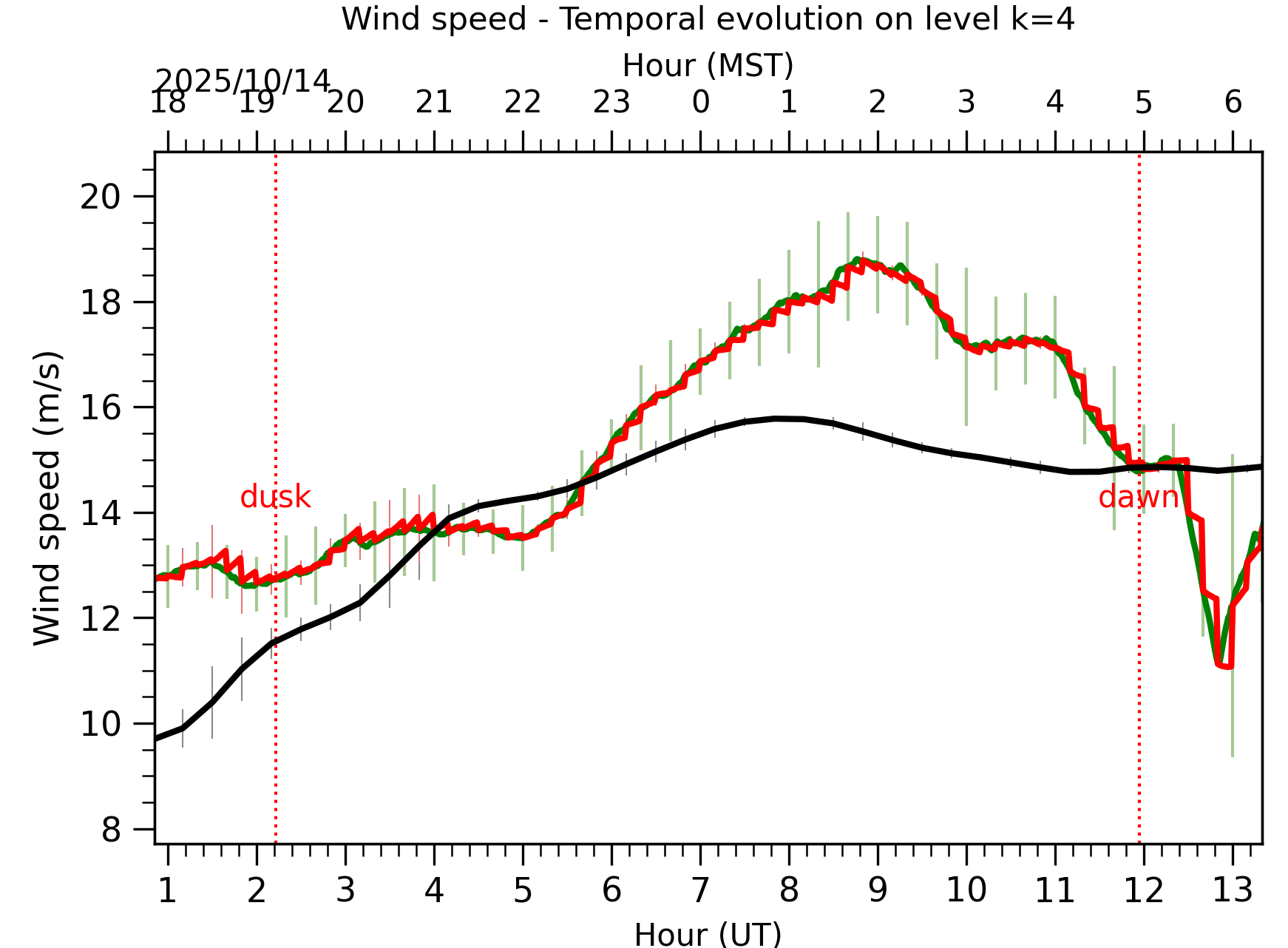 Fig. 3: Wind speed temporal evolution between the sunset and the sunrise at [17-38]m. |
