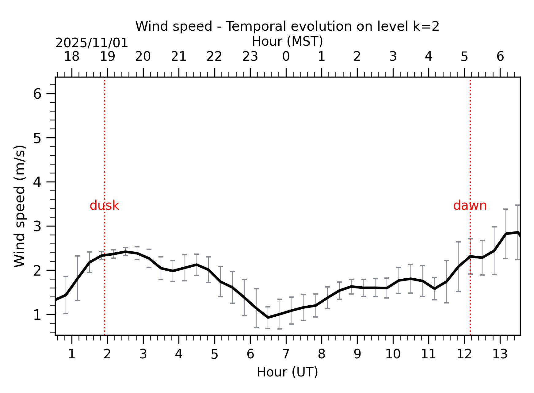 Wind speed temporal evolution between the sunset and the sunrise. Astronomical dusk and dawn are shown too. Wind speed values are representative of the first vertical grid points of the model. Specifically three levels are represented:- Level K=2 ---> 8.5m a.g.l. (representative of the [0-17]m vertical slab).