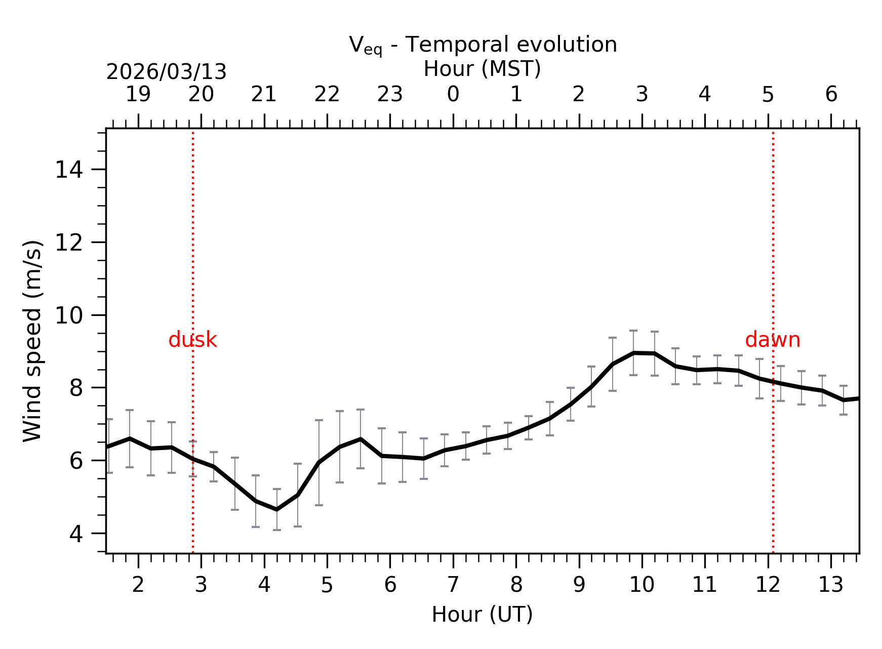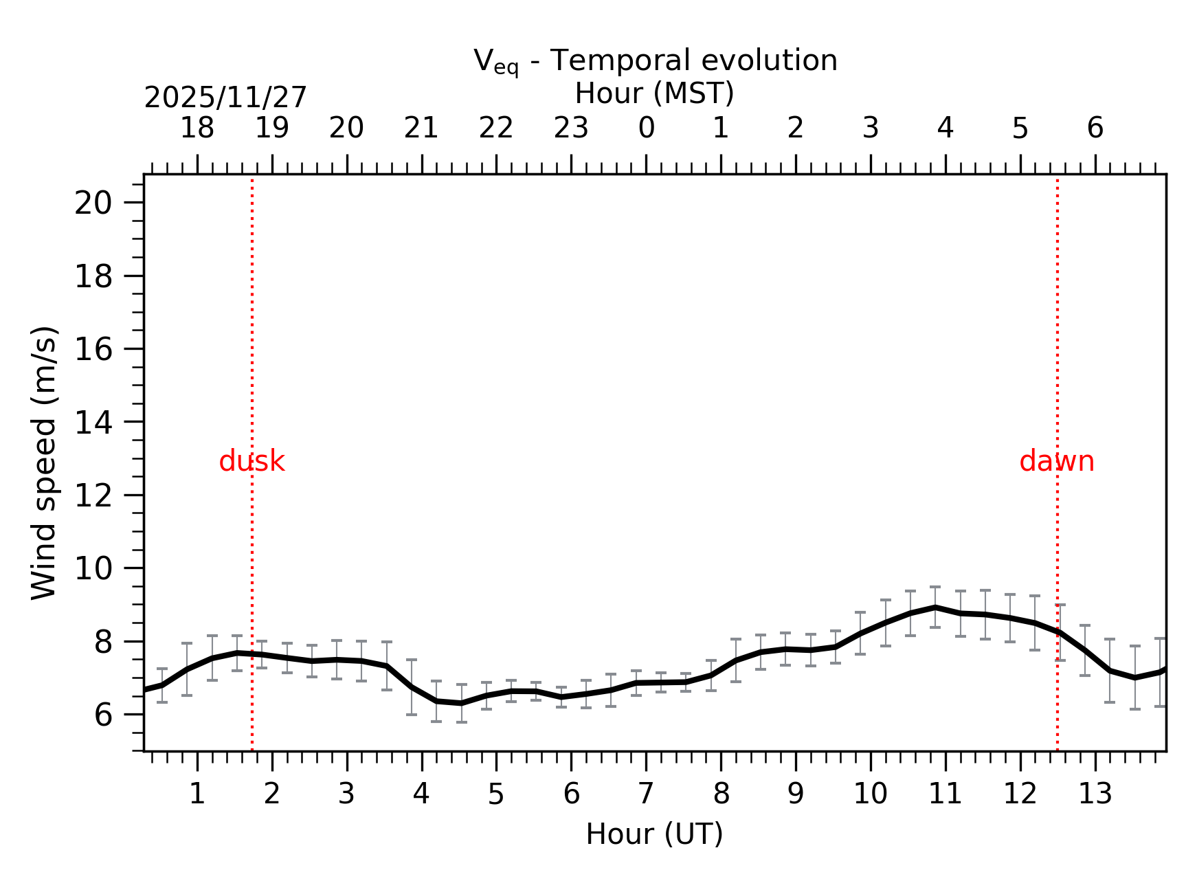 Astronomical dusk and dawn are shown too. On the x-axis is time in UT (bottom), in MST (top). Raw data points frequency is equal to the model time-step (typically from a fraction of second up to a few seconds depending on the model configuration used). Data points are re-sampled at a frequency of 20 minutes after a 1-hour moving average. The error bars are the sigma over the 20 minutes sampling, computed before the moving average. Veq gives us an information on how fast/slow an AO system has to run.