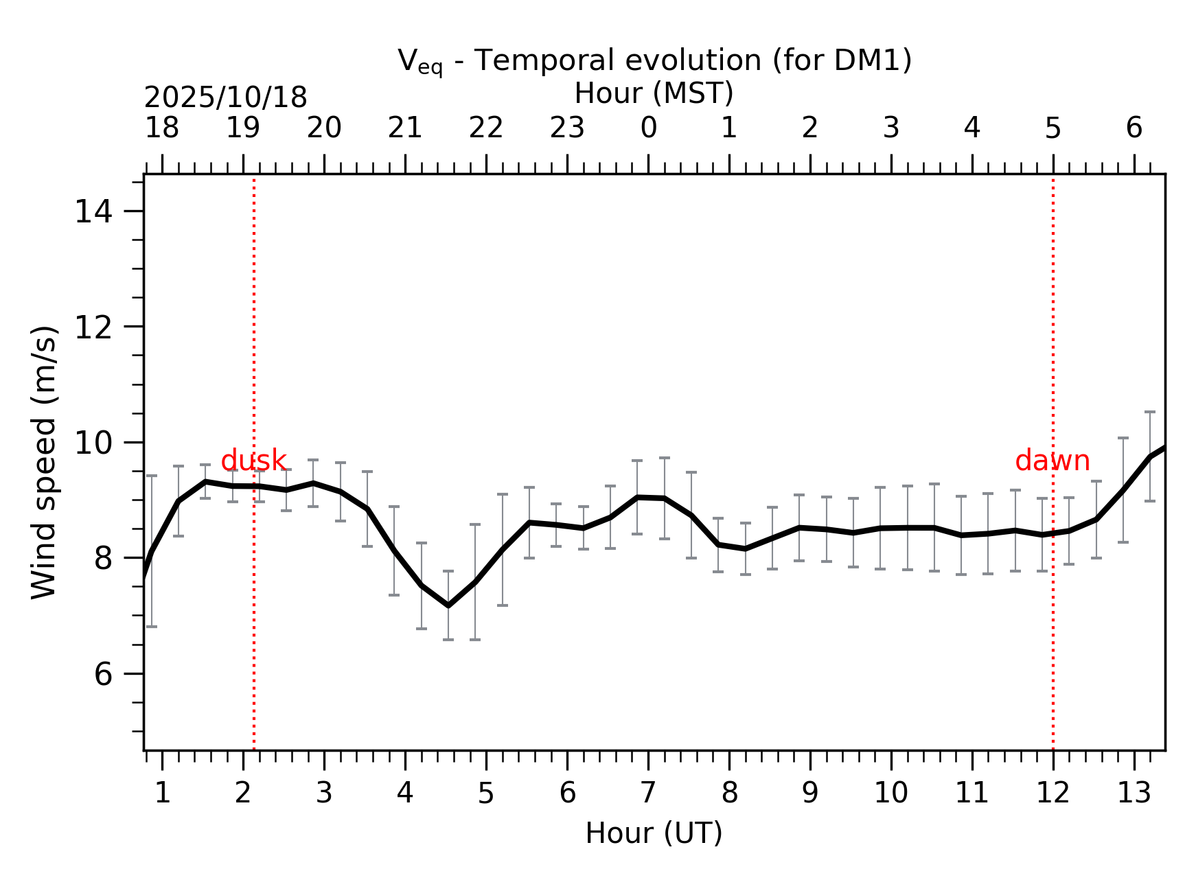 Astronomical dusk and dawn are shown too. On the x-axis is time in UT (bottom), in MST (top). Raw data points frequency is equal to the model time-step (typically from a fraction of second up to a few seconds depending on the model configuration used). Data points are re-sampled at a frequency of 20 minutes after a 1-hour moving average. The error bars are the sigma over the 20 minutes sampling, computed before the moving average. Veq gives us an information on how fast/slow an AO system has to run.